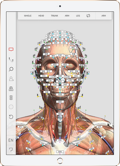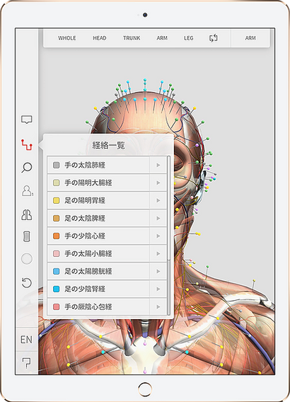 各経穴に刺入した鍼を表示し自在に視点を変えながら位置を視覚的に理解することができます。