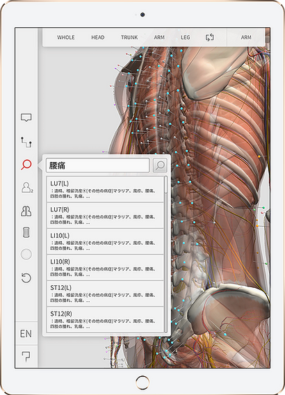 各経穴の情報(適応・筋肉・神経・血管等)を表示することができます。